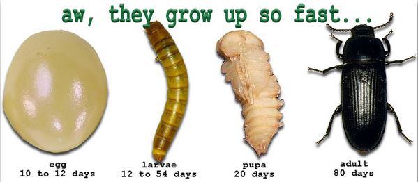 Mealworms start out as eggs, and take anywhere from 4-30+ days to hatch. Once they hatch, mealworms start out as tiny tiny worms slowly growing into the bigger worms you can feed off to your animals. This growing phase can take over 10 weeks, and the larvae will continue to grow and molt several times as they eat and develop. Once they are ready, the mealworms will burrow down below the surface of your grain and shed their exoskeleton one last time. The larva will turn soft, stop moving and curl into a C shape, then transform into a white or yellowish pupae. Pupae do not eat or move much, and this stage of their growth can last 6-20 days. After they complete their metamorphosis, the pupa will turn into darkling beetles. These beetles are light brown when they first emerge, but turn dark brown/black after a few days. The beetles cannot fly and males and females look identical. Darkling beetles start to lay their eggs 9-20 days after their emergence. They lay eggs for a few months, and then they die. They cycle begins again as the eggs hatch into tiny whitish worms, which may not be seen easily for several weeks until they grow bigger.